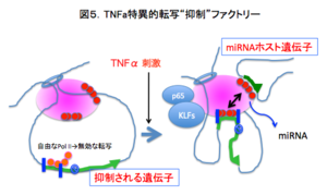 従来研究チームが報告してきたマイクロアレイの結果は、TNFα刺激によって誘導される遺伝子群のみならず、抑制される遺伝子群も明らかにしていたが、それらの遺伝子制御機構については充分明らかにされていなかった。そこで、既報の転写"促進"ファクトリー(図1)と同様の転写複合体によって、miRNAホスト遺伝子とTNFα抑制遺伝子が同時に転写されることによって、産生されたmiRNAが効率的にターゲット遺伝子産物にアプローチすることができる転写"抑制"ファクトリーが存在するという仮説をたてた。
